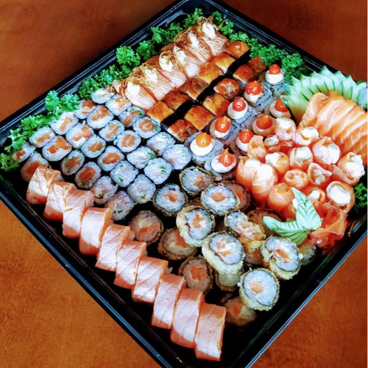 6 Sashimi de Salmão, 4 Salmão Ice, 4 Sushi Skin, 10 Hot Philadelphia, 8 Philadelphia, 5 Kani Maki, 3 Skin Roll e 2 Harumaki Salmão.